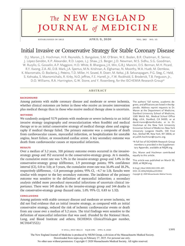 “Initial Invasive or Conservative Strategy for Stable Coronary Disease” adalah judul dari sebuah uji klinis besar yang juga dikenal sebagai ISCHEMIA Trial. Uji ini dirancang untuk menentukan apakah pendekatan invasif (seperti prosedur angioplasti atau pemasangan stent) atau pendekatan konservatif (pengobatan medis saja) lebih efektif untuk pasien dengan penyakit jantung koroner stabil.