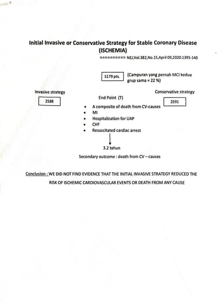Dari hasil ini, penelitian ISCEMIA menyimpulkan bahwa untuk pasien dengan penyakit jantung koroner stabil, strategi pengobatan medis konservatif dapat menjadi pilihan yang cukup efektif dan tidak memerlukan prosedur invasif seperti angioplasti atau pemasangan stent, yang sering kali dilakukan untuk mengurangi gejala. Pengobatan medis yang optimal (dengan obat-obatan yang sesuai) dapat memberikan hasil yang setara dalam mencegah kejadian jantung serius tanpa memerlukan intervensi invasif yang lebih mahal dan berisiko.